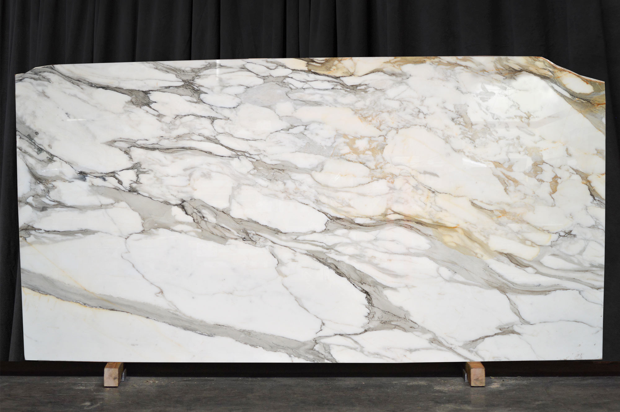 Calacatta Borghini is a large-format natural marble slab from Italy, ideal for floor, countertop, wall, or fireplace applications. Elegant vein movements with stunning gold accents.