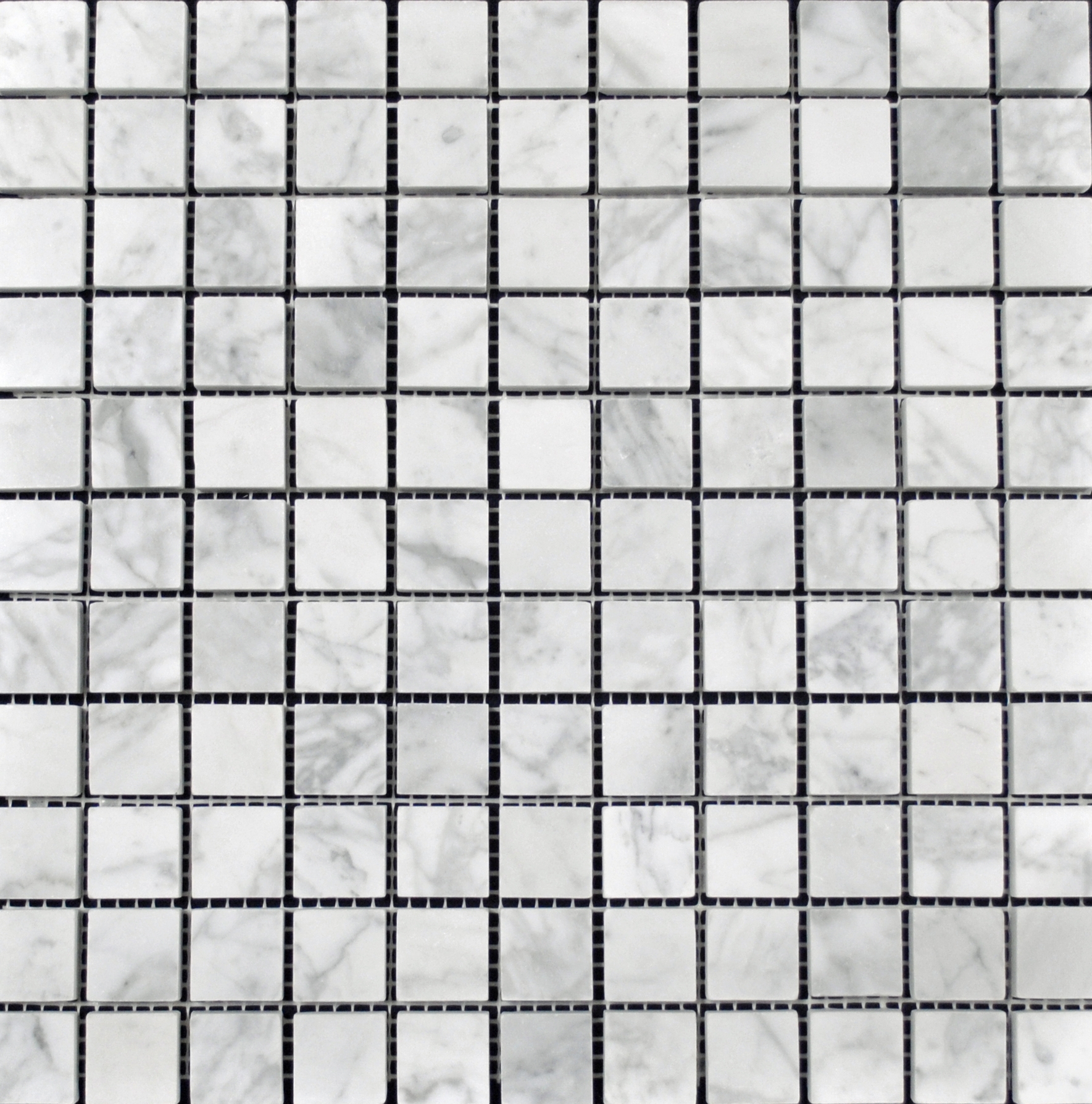 Carrara White 1×1 marble from Italy has a white base tone with beautiful grey accents that are apparent across this mosaic. It also has a polished finish to emphasize the color of the marble or a honed finish for a smooth matte look.