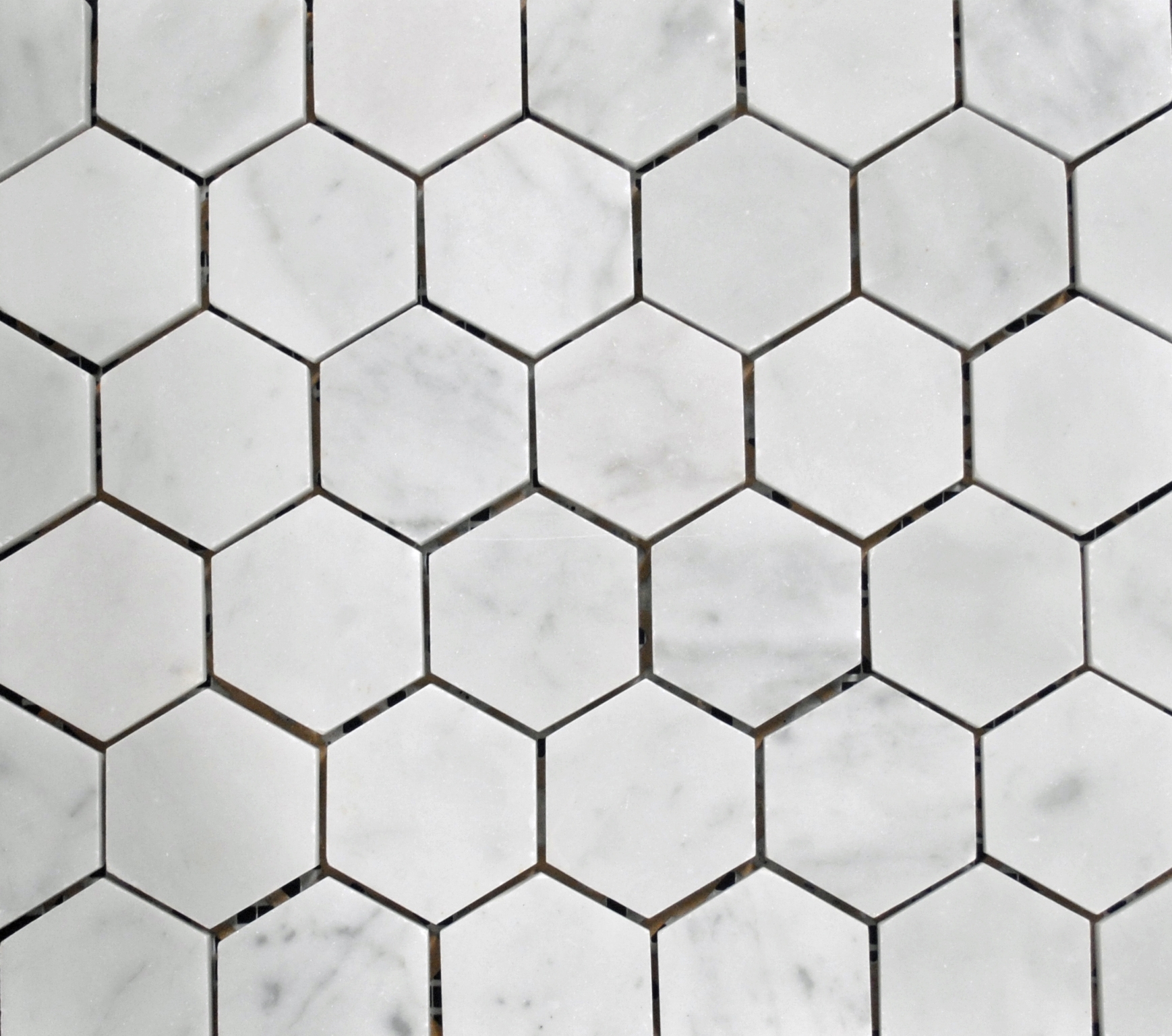 Carrara White 2? Hexagon marble from Italy in a white color has grey accents which give this piece subtle, but beautiful detail. This mosaic also comes in a polished finish for a waxed shiny look or a honed finish for a smooth matte look.