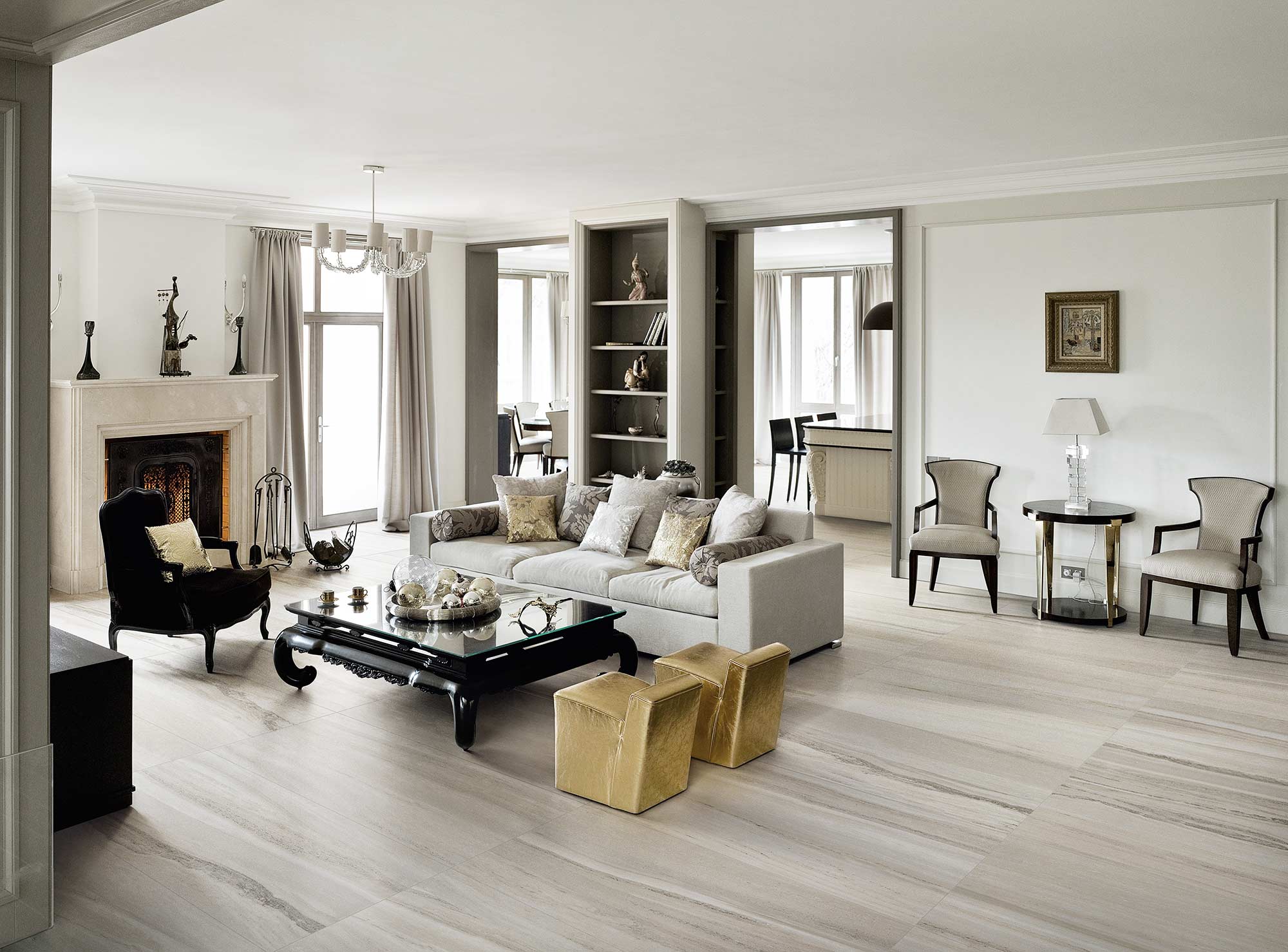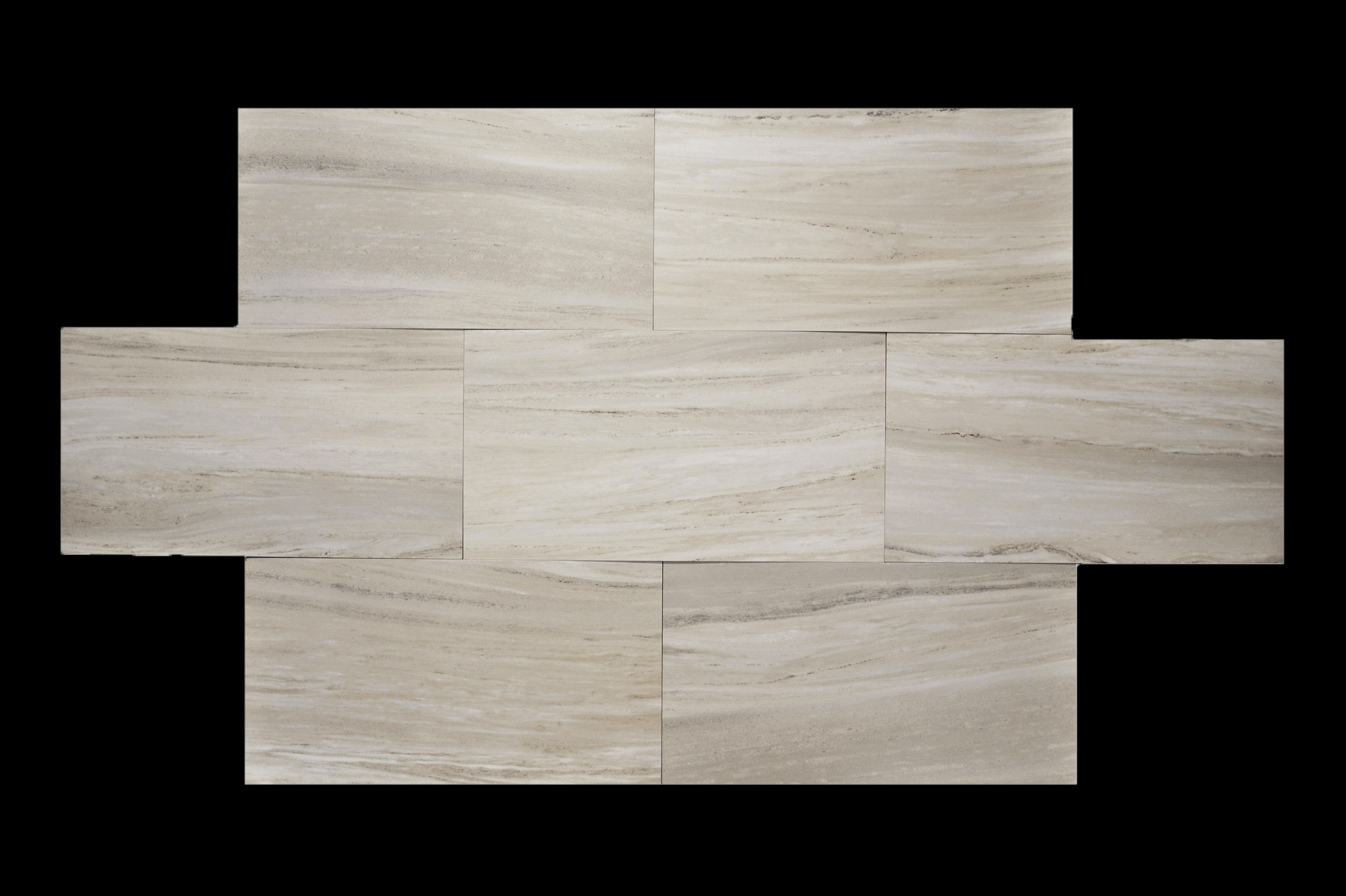 Greige porcelain tile a part of the Flow collection. Highly detailed grain movements inspired by the orobico marble. Ideal for interior flooring and wall applications.