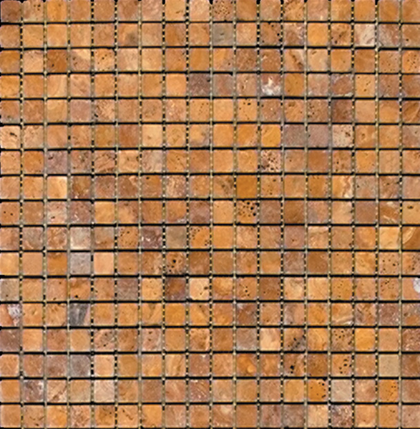 Golden Sienna 5/8×5/8 travertine comes in a brown, gold, and orange color detail for an old rusted appearance. This mosaic also has a tumbled finish for a look of smoothed down natural orientation of stones.
