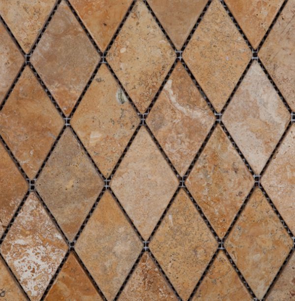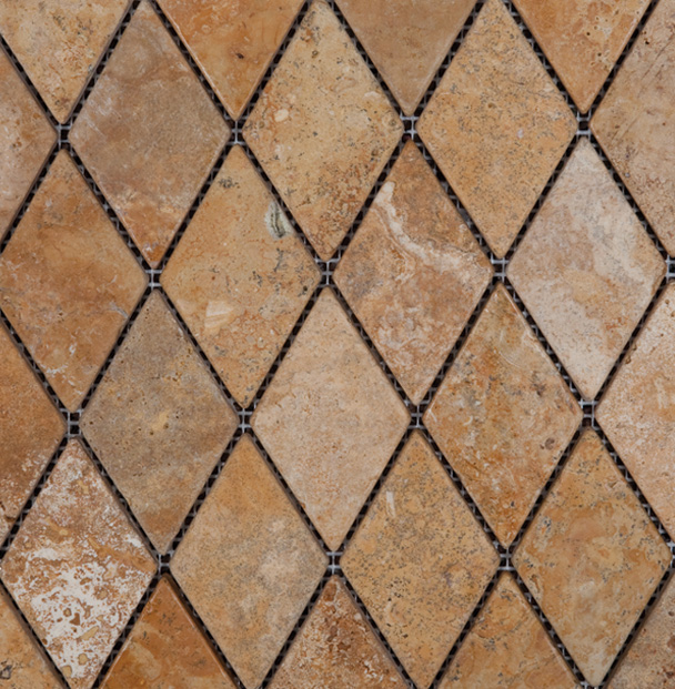 Golden Sienna Rhomboid travertine comes in a brown, yellow, and gold color detail from a country of origin of Turkey. This mosaic also has a tumbled finish for a smoothed down, natural arrangement of stones.