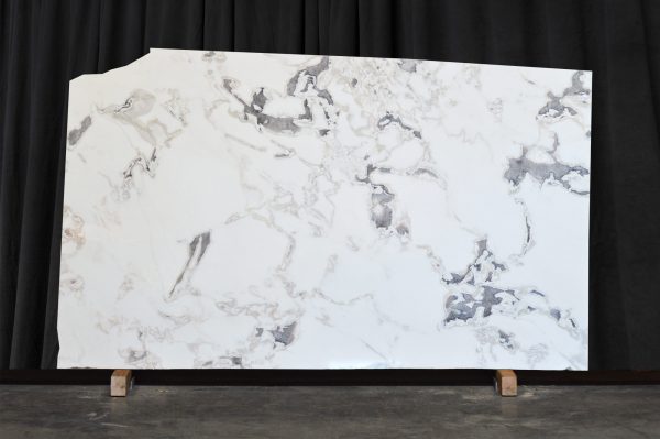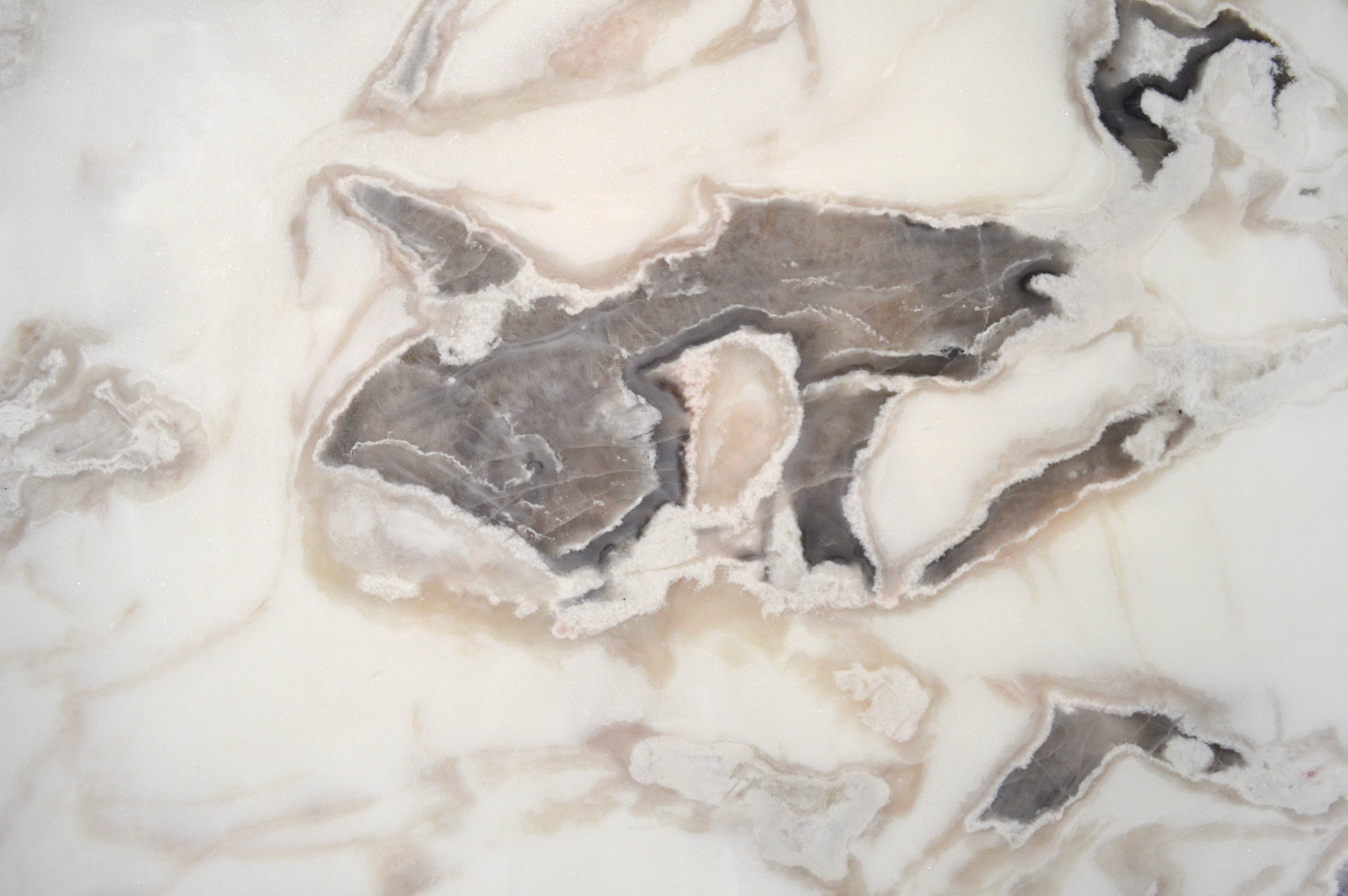 Natural white dolomite slab with stylish grey and cream details. Perfect for flooring, walls, and countertops.