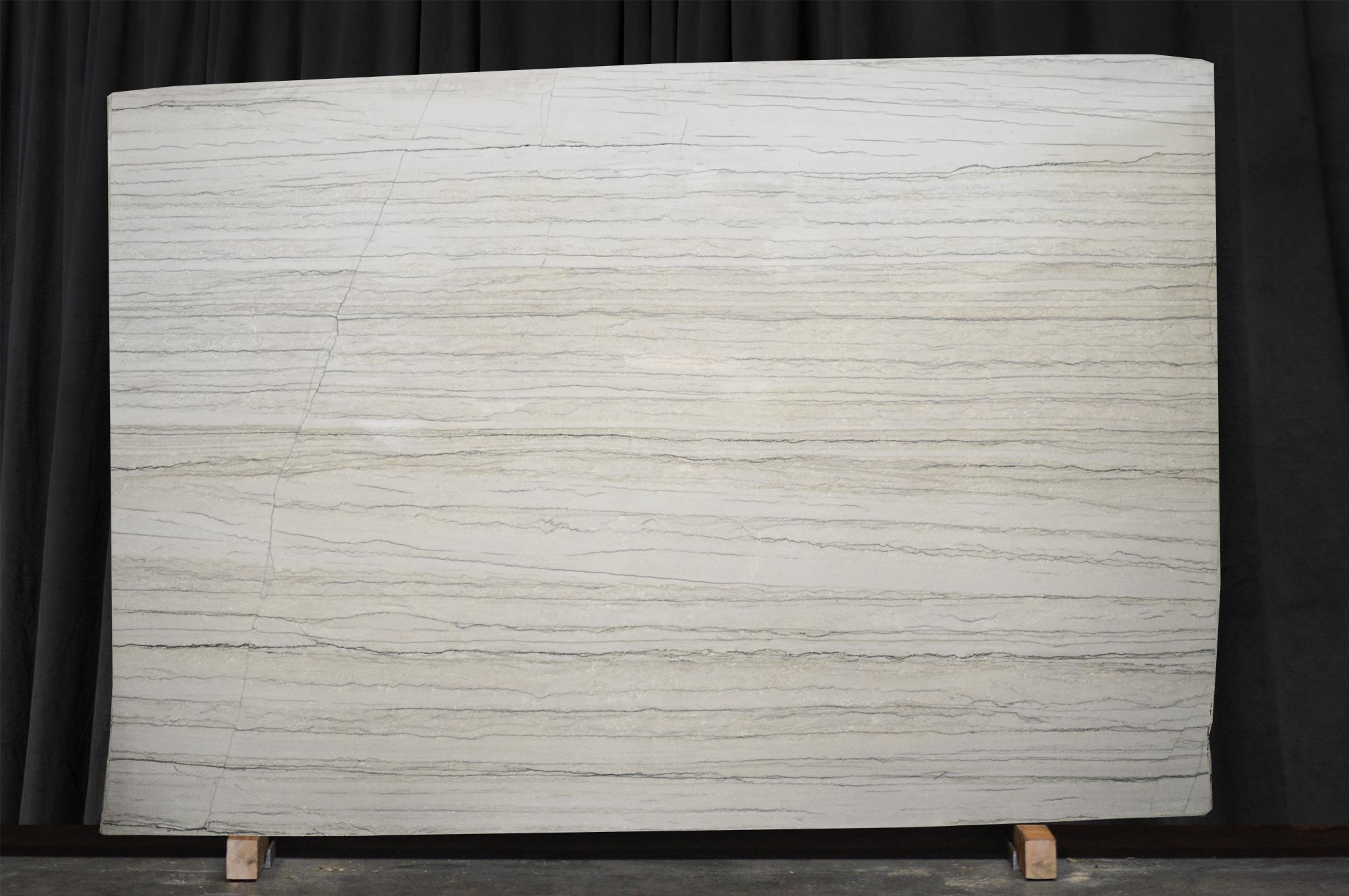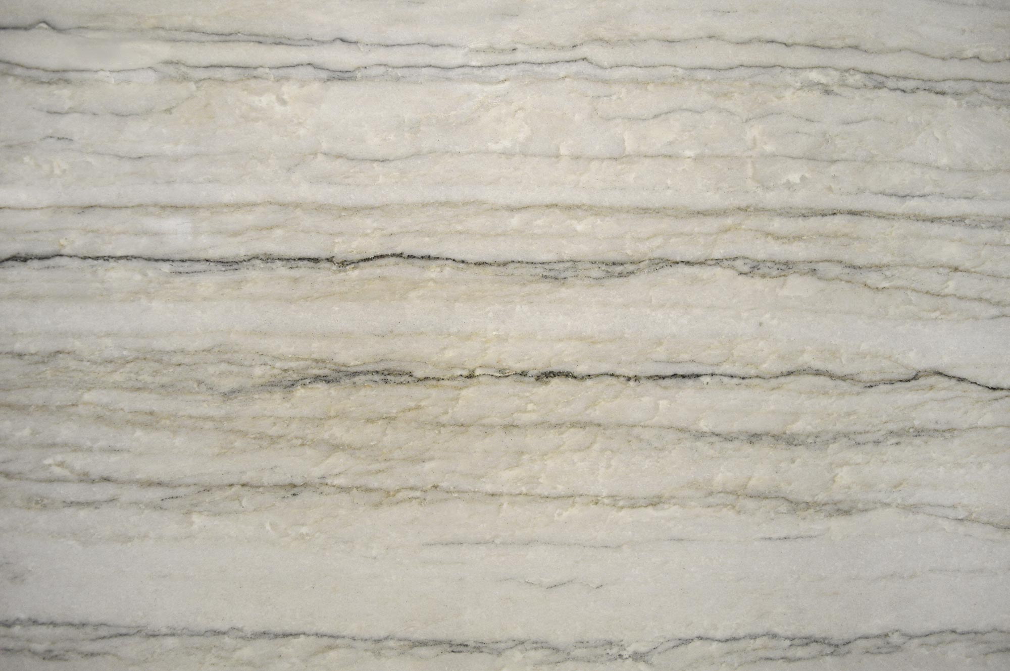 White Macaubas vein cut natural quartzite slab. Grey white colored natural slab with dark parallel veins. Ideal for flooring, walls, and countertops.