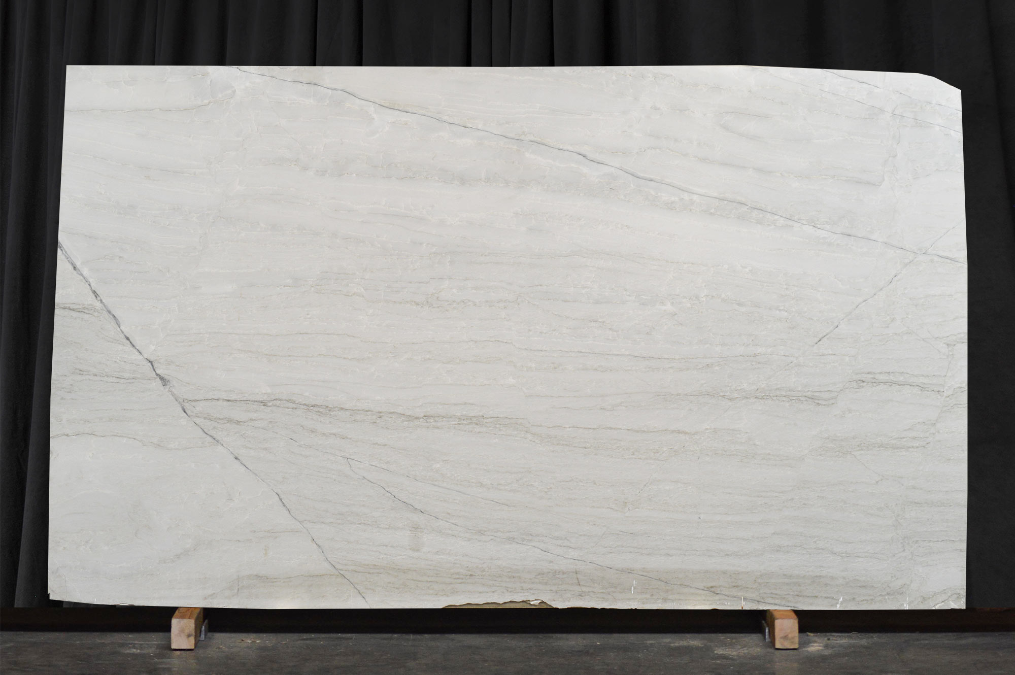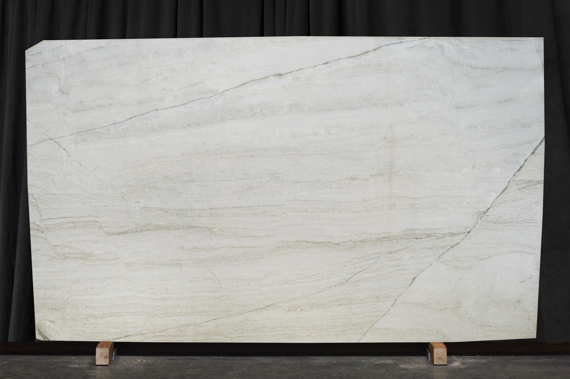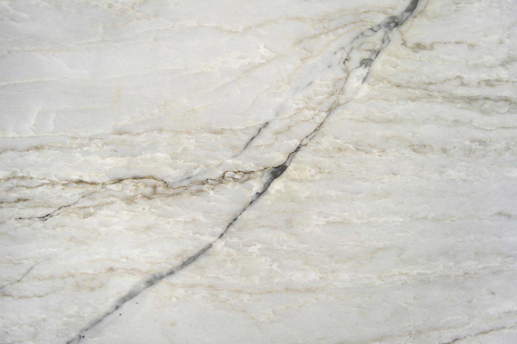 White Pearl natural large format quartzite slab available for wholesale. Exotic stone that features warm hues with intricate vein details.